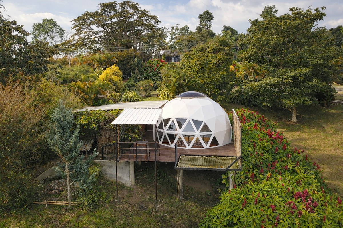 Escápate con tu pareja a este acogedor domo entre Filandia y Quimbaya. Ideal para una experiencia única, rodeado de naturaleza y con acceso rápido a los principales destinos del Quindío. Relájate en la malla de catamaran y disfruta de un delicioso desayuno incluido. Tranquilidad, comodidad y romanticismo en un solo lugar. ¡Perfecto para celebrar el amor! Ten en cuenta que la cabaña se encuentra a 9,6km del parque de Filandia, pero es muy fácil llegar en transporte público o vehículo particular.
