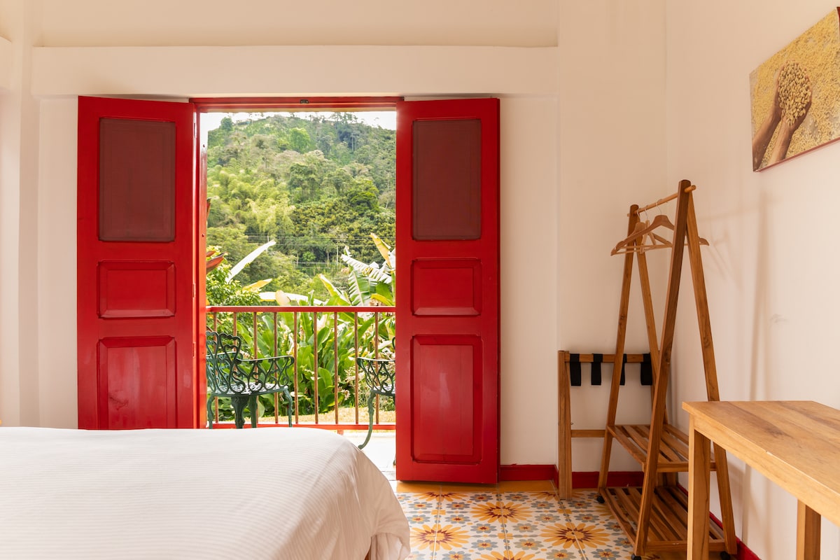 No querrás irte de este lugar tan único y encantador. Esta habitación es ideal para 2 personas, cuenta con cama Queen (1,60x1,90m), Sofa cama, baño privado, Tv pantalla plana, agua caliente y wifi. Ubicada dentro del Hotel Don Julio que se encuentra en el parque principal de Filandia. Resaltamos El Mirador, un lugar maravilloso para conocer. Adicional la Habitación tiene vista al parque principal.