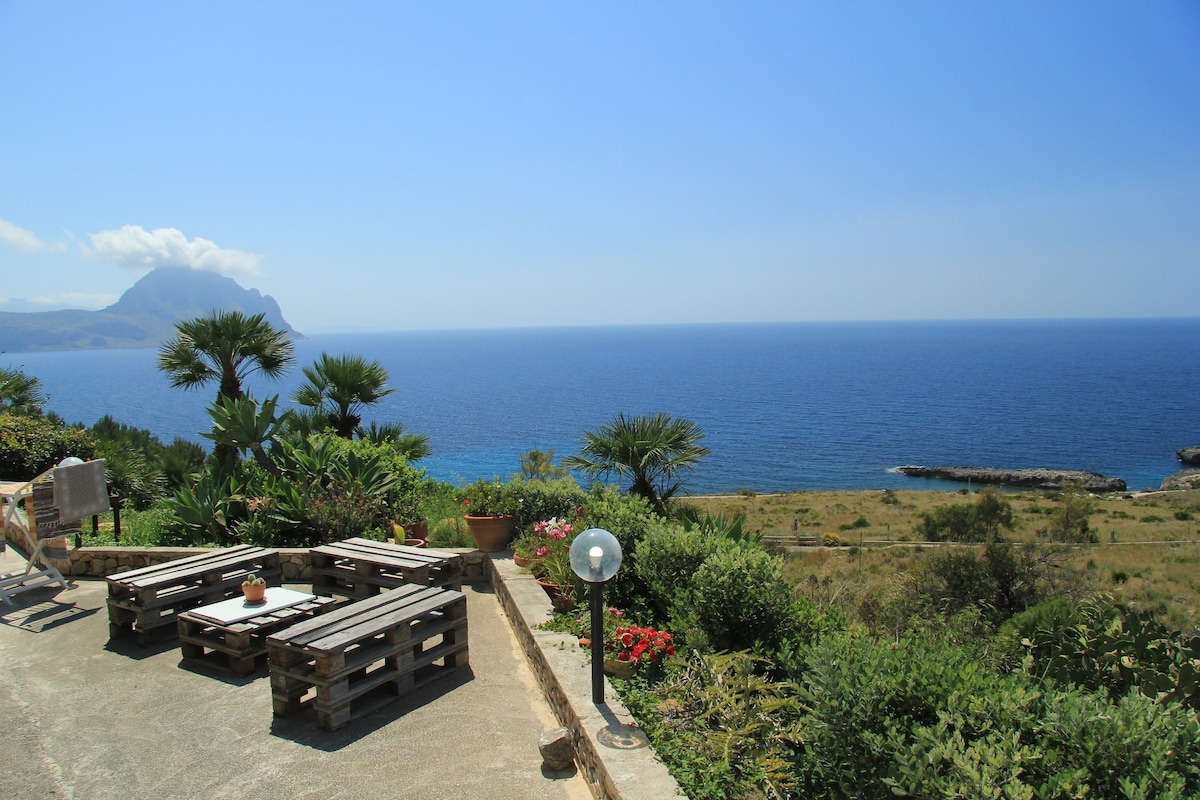 Casa in stile dentro la riserva naturale del Monte Cofano a circa 400 m dal mare con una splendida vista sulla baia di Macari ,contesto naturale esclusivo. La casa era un vecchio rifugio contadino ed è stata ristrutturata con estrema cura dei particolari in tufo e pietra balata. E’ un luogo per gli amanti del relax, natura e privacy. All’esterno il giardino ha vista mare sull'intera baia ed è terrazzato con pietra balata antica e mosaici e una panca in pietra e ceramiche siciliane.