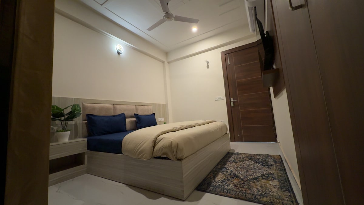 A calm and cozy 1BHK—perfect for couples, small families, and peaceful stays. A very comfortable, pet-friendly stay for families and friends with free parking and lift access. The apartment features a spacious, well-equipped living room, a functional kitchen with a fridge and stovetop, and one separate rooms with clean, private attached bathrooms. Guests can enjoy cooking, relaxing, and listening to music with loved ones.