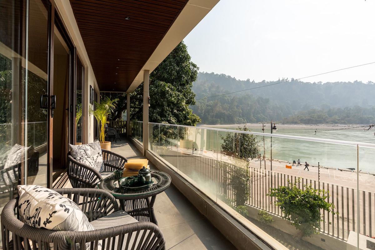 Step into a sanctuary where modern comfort meets the serene spirit of the Ganga. Nestled just steps away from the river, this stylish and calming retreat is designed for travelers who seek peace, rejuvenation, and a touch of luxury. Wake up to soft sunlight filtering through large windows, enjoy your morning chai on a private balcony with fresh river breezes, and unwind in thoughtfully curated interiors that bring together elegance, comfort, and nature.
