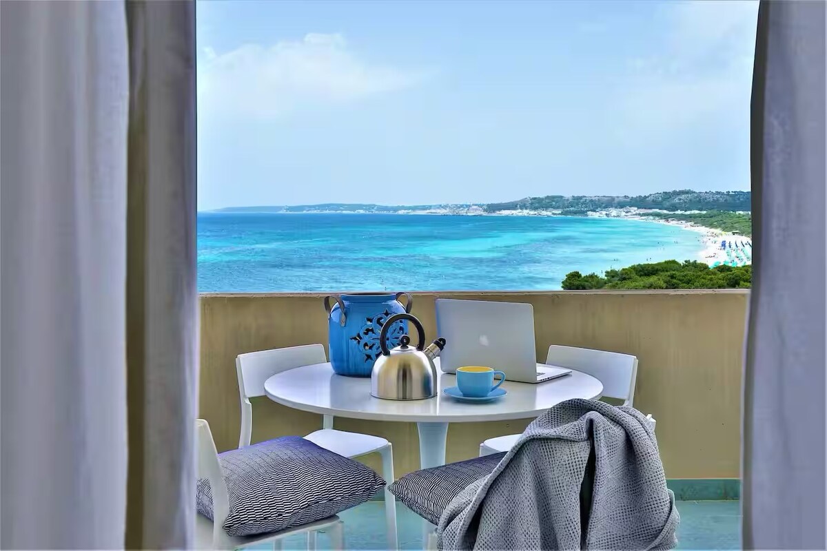 L'appartamento, di recente fattura, offre un grandissimo terrazzo con una vista panoramica sul mare e su tutta la costa. Troverete a disposizione lenzuola, asciugamani, JACUZZI RISCALDATA, BARBECUE , stoviglie, ARIA CONDIZIONATA, TV satellitare, lavatrice, WI-FI. A cinquanta metri ci sono ristoranti, negozi e il mare, sia scogliera che spiaggia. A 3km da Gallipoli, 2km dal parco acquatico Splash, 4km dal Parco Naturale "Porto Selvaggio". Letto matrimoniale