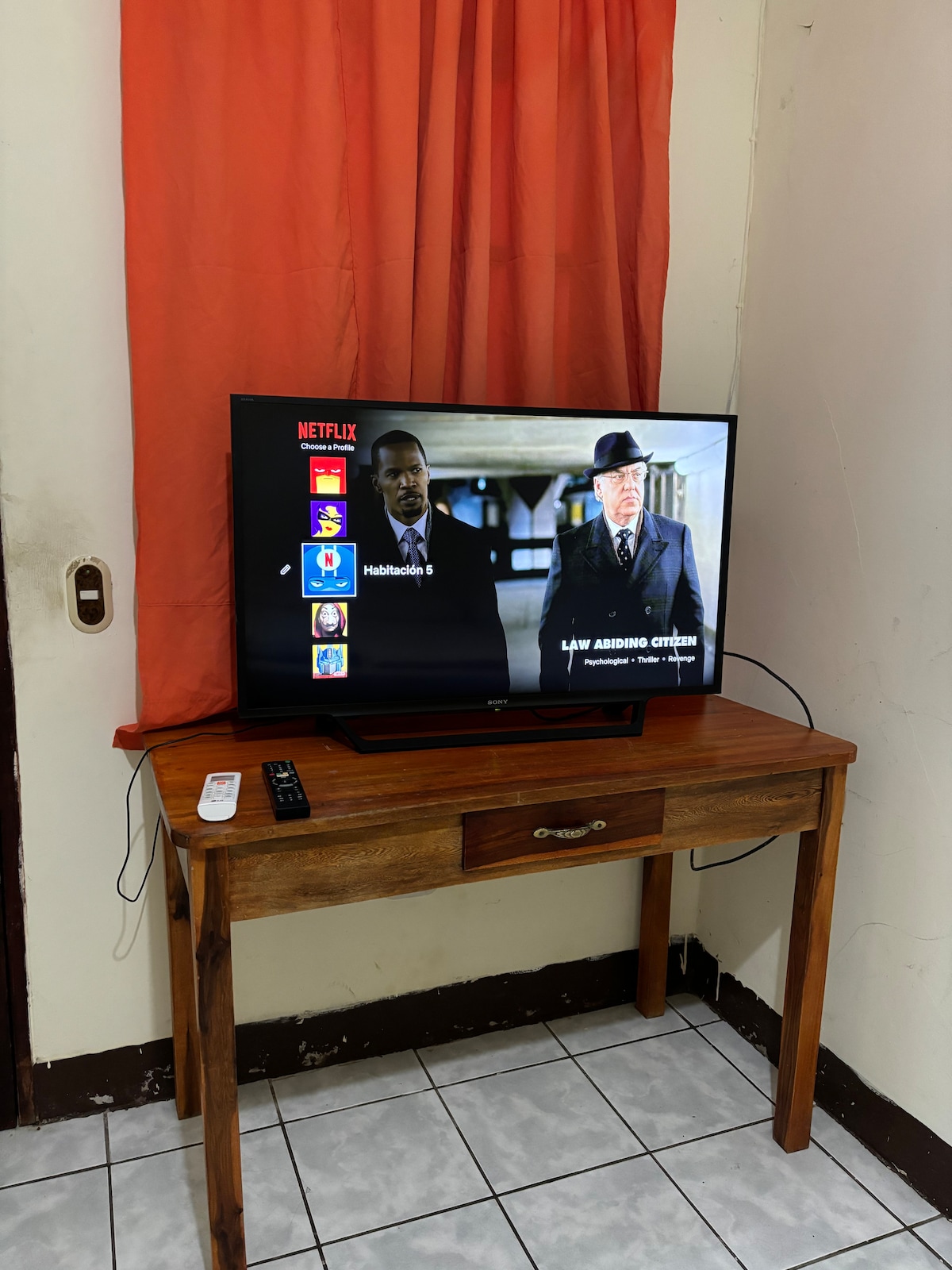 Habitación ideal para una o dos personas, con aire acondicionado, baño privado y TV Cable. El aire acondicionado es un split con control remoto. La televisión es por cable, pero cuenta con el servicio de Netflix, la recepción del Wi-Fi es muy buena y el baño cuenta con ducha de agua caliente. Esta habitación está en el primer piso. Se proporcionan sábanas, toallas, jabón de mano y papel higiénico. El servicio de limpieza siempre está a disposición del huésped.