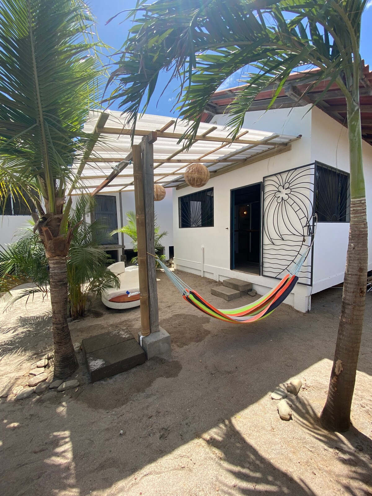 PRIVATE BEACH CABAÑAS (mediterranean style) with its own KITCHEN, FRIDGE and BATHROOM, double bed with an optional extra bed, so perfect for 1 person, a couple or group of 3. Situated 2 min walking to the beach, between SANTANA and POPOYO beach. Walking distance to some of the best surf spots in NICARAGUA. Common area includes POOL, BBQ and hammocks to chill out. We have WIFI, motorbike with racks and surfboards rental, surf guiding service so you can score the best spots in the area.