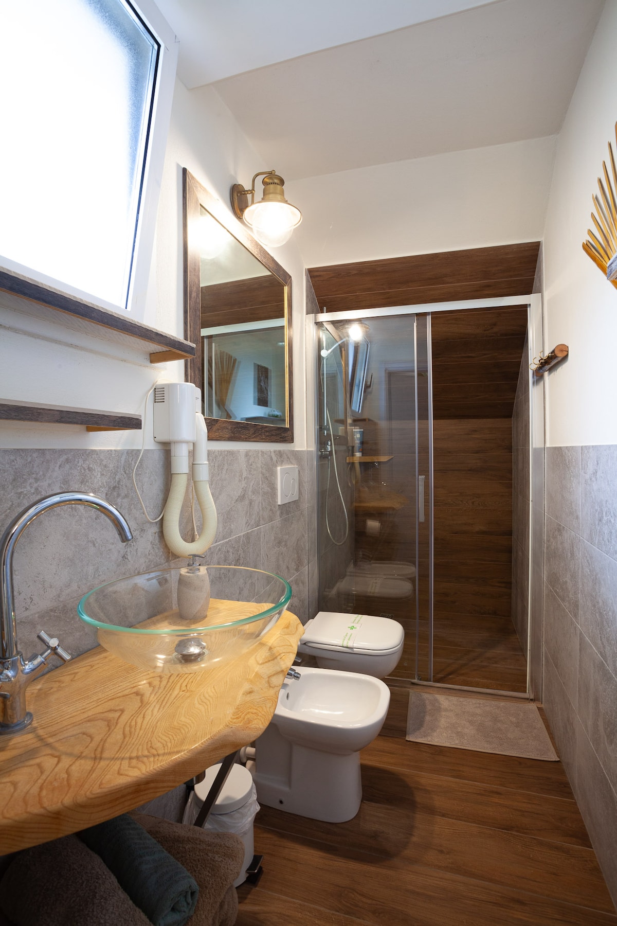 Stanza mansardata, ampia e tranquilla con bagno privato. Non è indipendente, si accede dall'ingresso posteriore di casa mia. Dispone di letto matrimoniale, letto a una piazza e 1/2, aria condizionata, tavolo, frigorifero, microonde, bollitore. Non ha cucina e non ha balcone. Fornisco io : lenzuola, asciugamani, shampoo e prodotti per la prima colazione. La cucina non è disponibile. È richiesto all'arrivo un contributo pulizie da 10,00 euro a 30,00 euro in base alla durata del soggiorno.