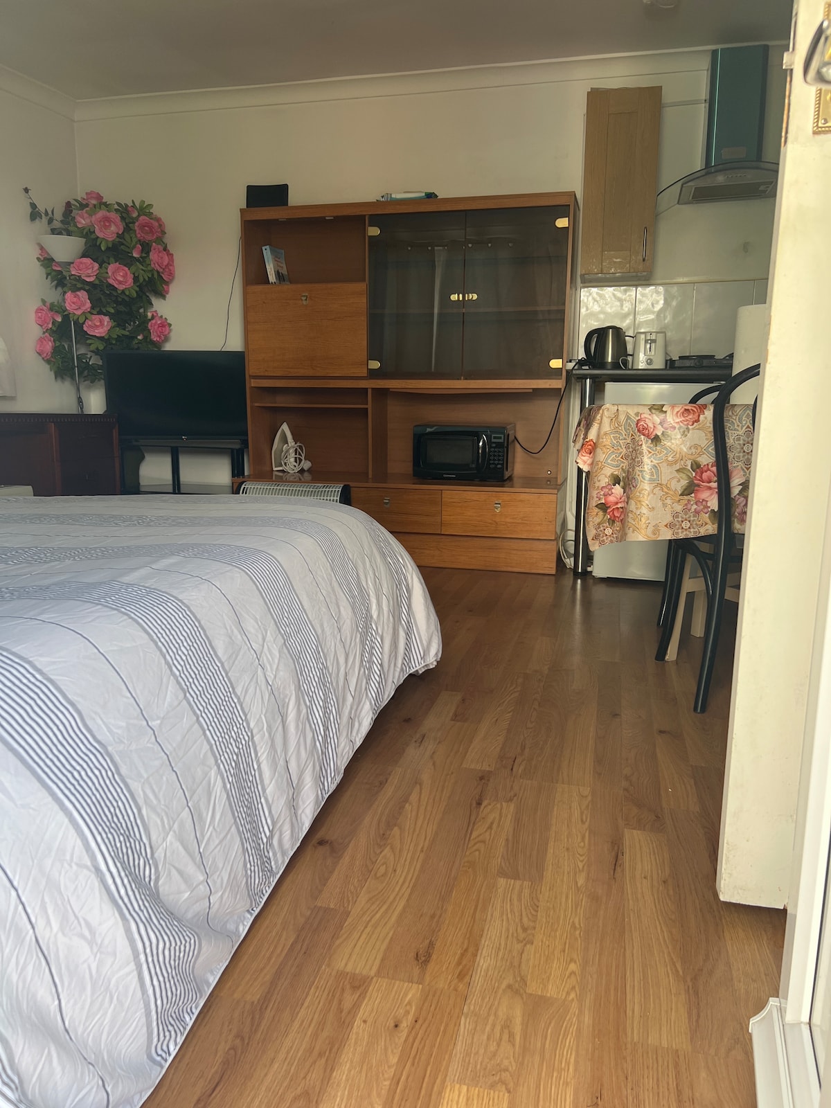 This unique place has a style of its own. It’s compact yet spacious and is ideal for couples, business stays, young professionals and even fitness enthusiasts or YouTubers traveling to London . Complete separate entrance with coded lock and key (self check in/out, no need to interact with host)HUGE TV with Netflix included .Includes a kitchenette, microwave oven, hot ring , plates , bowls , cutlery and all utensils .shower,toilet and a (king size) sofa bed. *Strictly no house parties