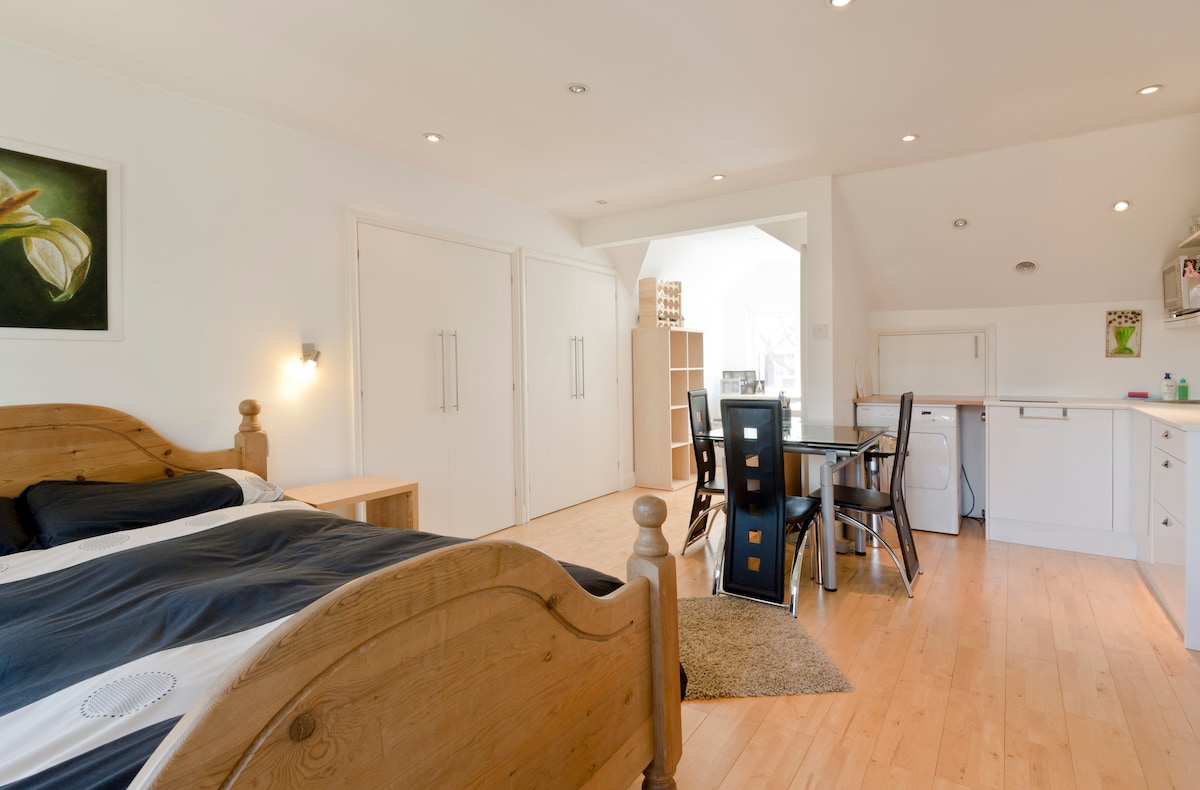 This top floor studio is a gem, close to central London. It is a tranquil, spacious hideaway in Finchley.The tube station is 7 mins walk away and takes 25 mins to all London highlights.Separate bathroom+kitchenette The kingsize bed has elegant hotel bedlinen with luxurious duvets & Alpaca throws with a choice of plump feather or anti-allergy pillows.There is off street parking available and easy links to major airports. Quiet location but close to cafes and shops.