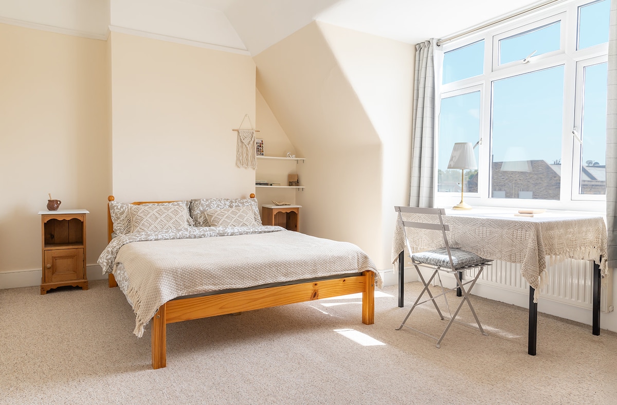 Classic decor with modern comfort in well preserved and beautifully maintained Georgian house. Close to train station, journey is 30 mins to Central. The bedroom has been lovingly restored and has a modern feel while preserving all its original features. It has two large west facing sash windows so is incredibly bright and airy. It has a very comfortable kingsize bed and ample built in wardrobe, desk and armchair. A beautiful modern bathroom (shared) with walk-in shower is just opposite.