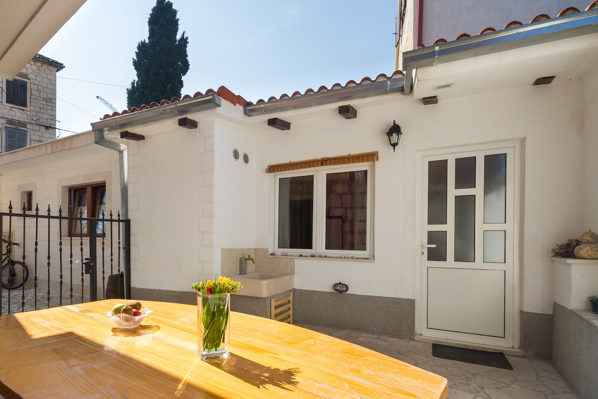 Charming petite house, with beautiful garden, ideal for meals under the stars. Great view at the city of Trogir and the sea. One bedroom, kitchen, living room, bathroom, five minutes easy walk from Old town and 8 minutes by foot from the beach.