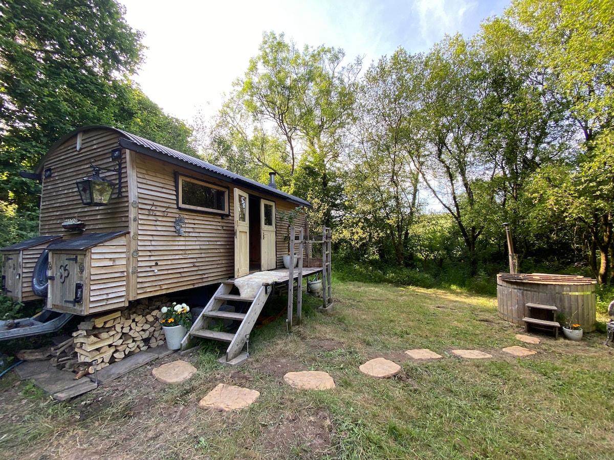 Nestled in a Devon orchard with uninterrupted country views is our green wagon and hot tub.Oak lined,log burner,sleigh bed. Copper,brass,leather.High end luxury reconnecting with nature and each other on your own.Ensuite wet room and mini kitchen.Cosy local pubs,country walks or snuggle up in the wagon.Enjoy the fire pit,use the telescope,explore nearby Exeter,beaches and Dartmoor.Retreat,rest,relax.Perfect hygge.The communal area has a fire pit with pizza oven,and a double hammock for your use.