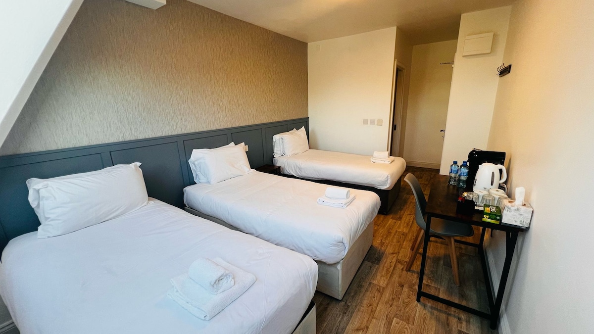 Our double rooms offer a spacious option for travellers, with rooms featuring one double bed (4 foot 6 inches wide). The triple glazed windows ensure any external noise is kept to a minimum. All rooms have an en-suite bathroom with bath, shower, toilet and sink, as well as complimentary toiletries. Coffee and tea making facilities are provided in the room. There is complimentary Wi-Fi throughout the hotel and in all rooms. Keep all of your valuables secure in our in-room safe. TV with a selection of Irish channels can be found in the room. Iron and ironing board and ice are available on request from reception.