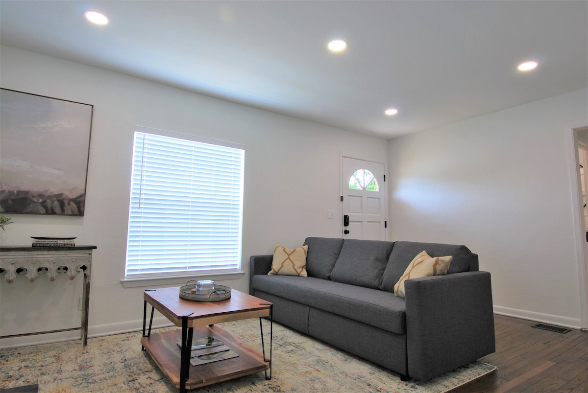 Take it easy at this unique and central getaway. This fully renovated 1920's bungalow has charm with all the modern amenities. Unwind in the glow of the patio fire pit. Create a masterpiece in the kitchen with modern induction stove, top of the line cookware, and stocked spice drawer. Cuddle up to your favorite movies with bedroom TV. Relax in the waterfall shower or soaking tub. Play in downtown Ft Worth(10min), or the Stockyards/Cowboys Stadium/Six Flags/Texas Ranger's Ballpark (20 mins).