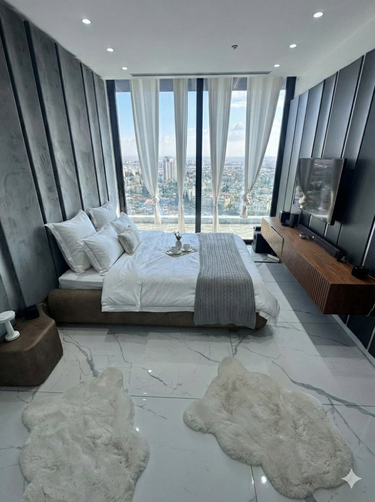 להתעורר מעל העננים. פנטהאוז בסטנדרט בינלאומי המציע חווית אירוח נדירה. הסלון העצום עטוף חלונות ענק, ולרשותכם שתי מרפסות מפנקות לקפה של בוקר או יין מול השקיעה. חדר השינה הוא יצירת מופת אדריכלית עם תקרות גבוהות וקירות זכוכית שפשוט מכניסים את הנוף למיטה. השילוב המושלם בין פאר, שקט ומיקום מרכזי מנצח.