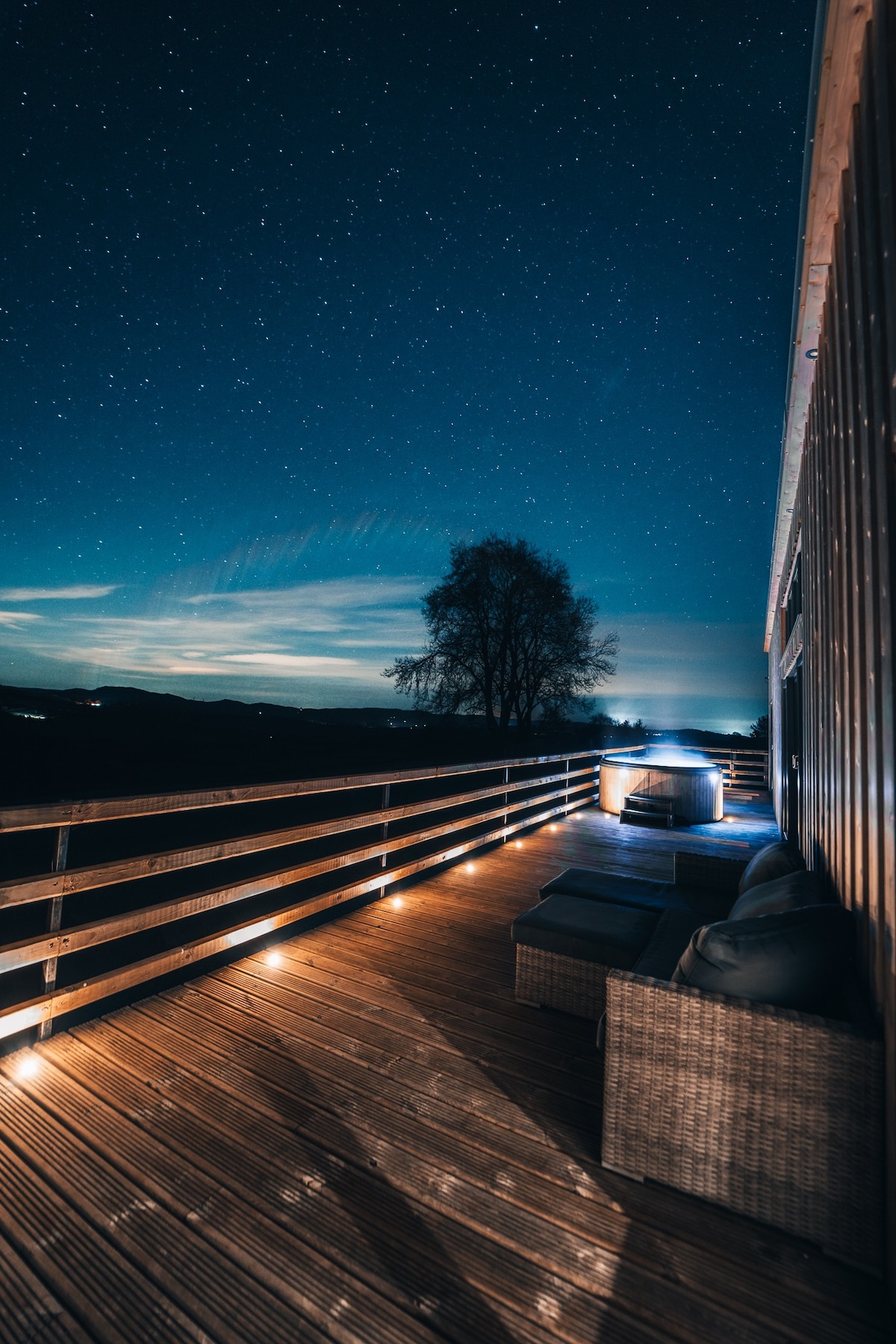 Cosy cabin nestled amongst hills & forestry, close to the Elan Valley. Surrounded by a working farm and beautiful Welsh countryside, with an abundance of walks from the cabin door. Private & tranquil, perfect for those wishing to escape the crowds and enjoy the great outdoors & local wildlife. A dark sky area. The cabin has a rustic luxury feel, with a wood fired hot tub, log burner, underfloor heating, boiling hot water tap, and a smart TV with sky sports, sky cinema, and Netflix