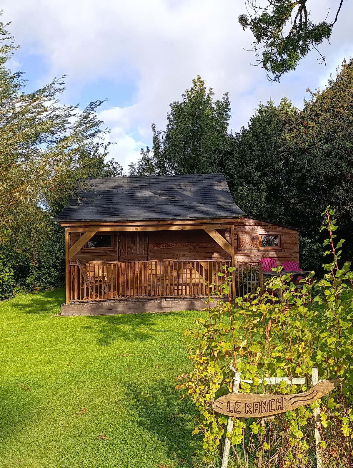 Nestled in nature's embrace, the Valhalla Cabin awaits the more adventurous souls who love serenity and peace of mind. In the wild, private garden you can find solace in the outdoor sauna or a soothing soak in the tub, all while the campfire crackles nearby. Explore the enchanting "Pays des Collines" by foot or bike, or indulge in the peace of your bed, waking to nature's gentle symphony. As twilight descends, you can cozy up for your favorite movie on a grand screen.