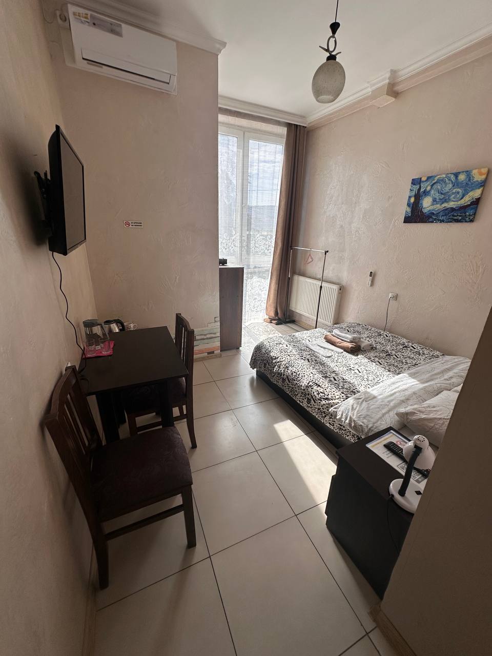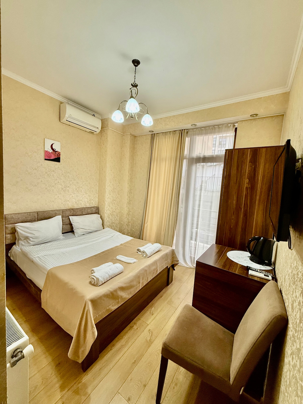 Welcome to Aparthotel Mtatsminda, located in the heart of Tbilisi near Rustaveli Avenue. Set in a historic building, our three newly renovated rooms offer quality mattresses, fresh linens, and kitchenettes for a comfortable stay. Located on the second floor, two rooms share a large balcony. All rooms face Mtatsminda Mountain with beautiful views of St. David’s Church and the Tbilisi TV Tower.