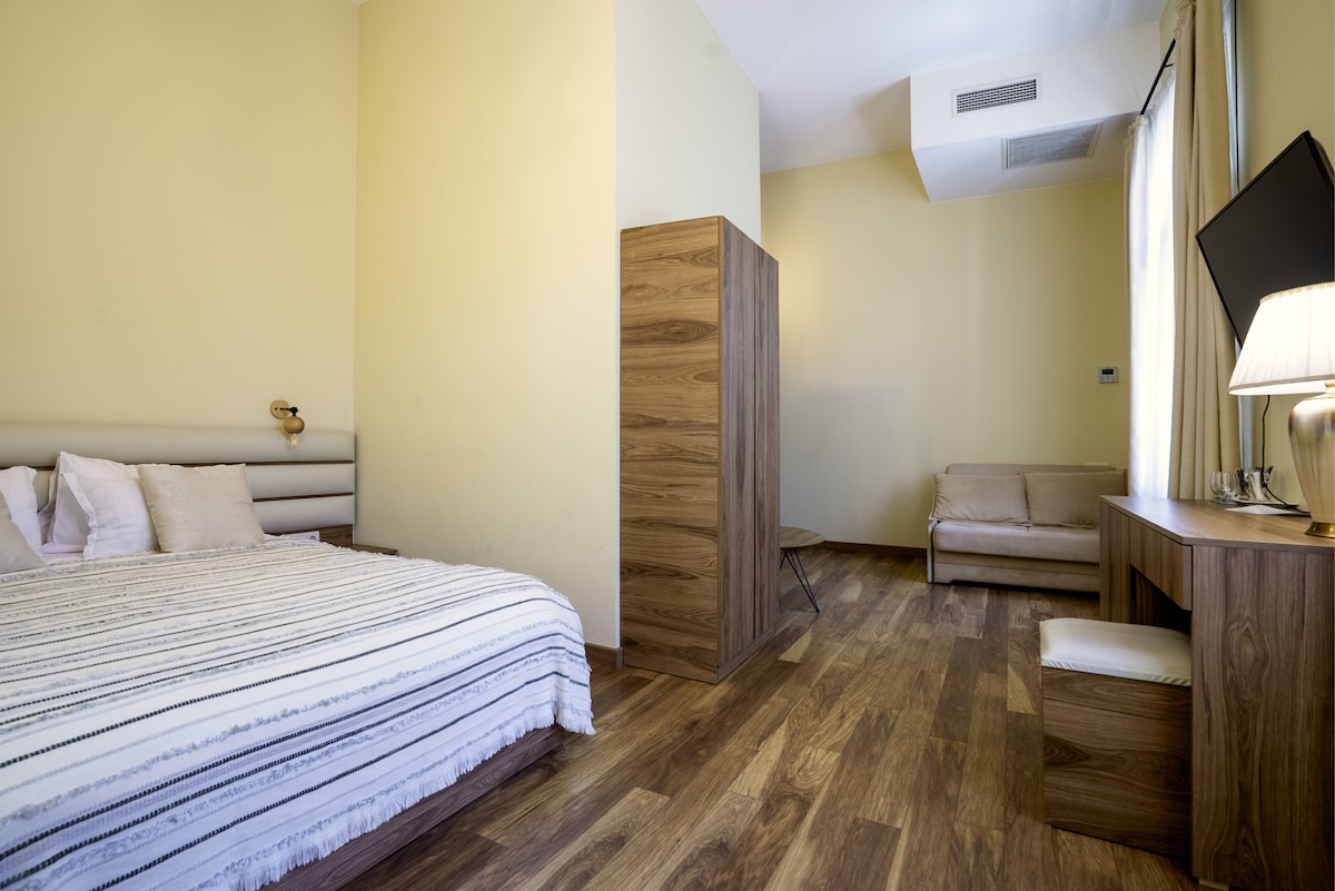 Bright room with two queen beds, ideal for small families or groups of four. Includes a private bathroom with a walk-in shower, free Wi-Fi, TV, safe, mini fridge, and an electric kettle with coffee and tea. Fresh towels, bed sheets, and toiletries provided. Shared kitchenette and co-working space available. This room faces the rear side of the building. Located in central Vake. Contactless check-in/out