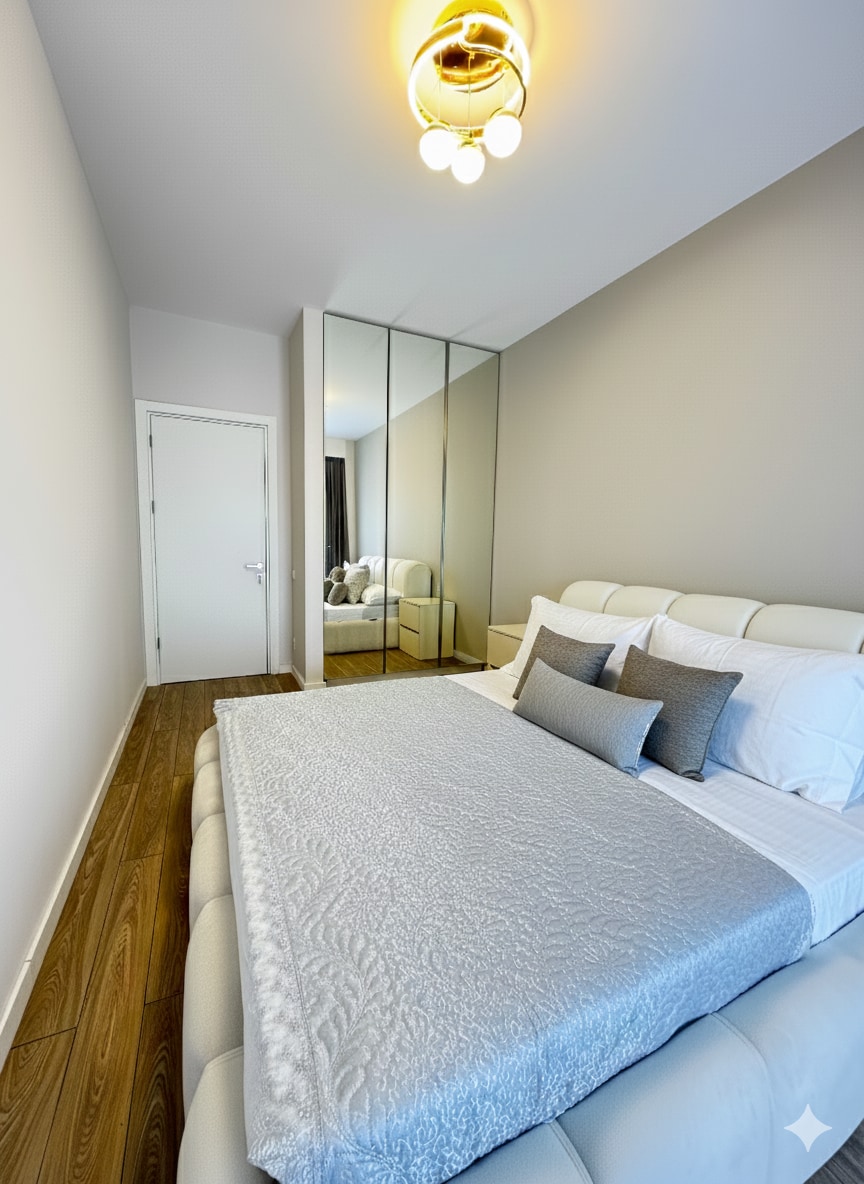 Elegant studio in Saburtalo, Archil Tsagareli 50, featuring a separate kitchen and private terrace with stylish seating. Located on the 3rd floor (accessible like 2nd). Enjoy a high-definition projector, induction stove, microwave, dining area, and designer tableware. Rest on a premium orthopedic bed and benefit from smart lock entry, workspace, robes, fresh linens, towels, toiletries, iron, vacuum, and hair dryer — a refined, comfortable retreat designed for modern living.