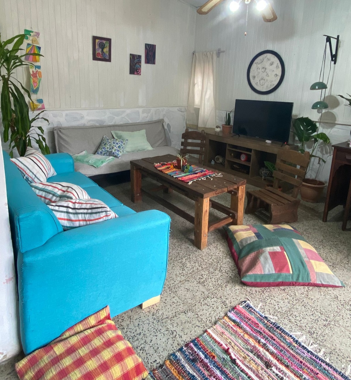 Nuestra casa es un lugar, funcional con luz natural, perfecto para una estancia cómoda. Cuenta con dos cuartos y dos baños, ideal para grupos pequeños o familias. Dispone de un patio con césped, donde podrás relajarte al aire libre. La ubicación es excelente, ya que se encuentra a tres cuadras de la avenida principal de Rivera y a tres de la línea divisoria, con fácil acceso a todos los servicios y comodidades de la zona. Internet a través de celular para compartir datos.