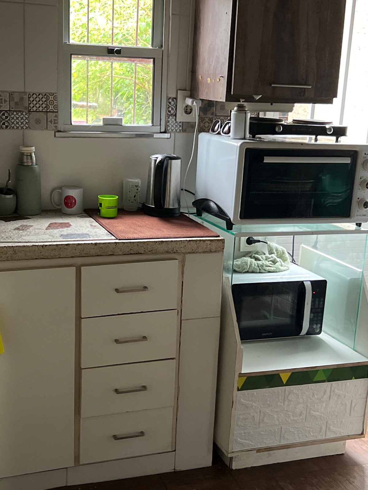 contamos con un amplio dormitorio con vista al jardín del frente a través de un gran ventanal, el balcón está enrejado y es techado por lo que es seguro. La cama y sillas son Luis XV con sábanas, toallas, tv Smart, estufa a leña (la leña es por cuenta del huésped) y aire acondicionado. Contamos con un segundo dormitorio con dos camas de una plaza. además una cocina pequeña completa con utensilios básicos.