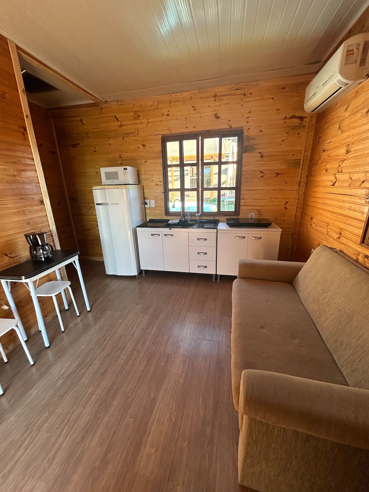 contamos con un amplio dormitorio con vista al jardín del frente a través de un gran ventanal, el balcón está enrejado y es techado por lo que es seguro. La cama y sillas son Luis XV con sábanas, toallas, tv Smart, estufa a leña (la leña es por cuenta del huésped) y aire acondicionado. Contamos con un segundo dormitorio con dos camas de una plaza. además una cocina pequeña completa con utensilios básicos.