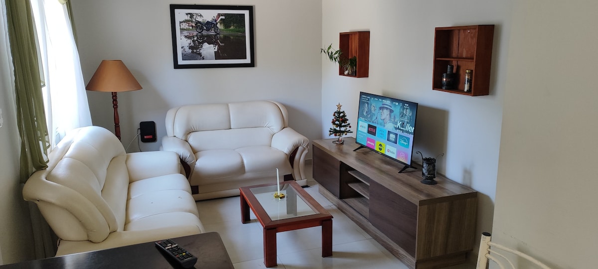 Apartamento residencial e familiar. Dois dormitórios com ar condicionado (um com cama de casal e outro com uma cama de solteiro), um banheiro, cozinha completa, sala de estar com smart TV e sofá cama. Internet e vaga de garagem coberta para um veículo em condomínio fechado monitorado por câmeras de segurança. Oferecemos conjunto de cama e banho. No uso mensal, taxas adicionais de consumo de energia elétrica podem ser cobradas caso o valor ultrapasse R$150,00.