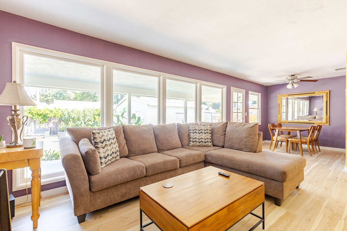 This light-filled house is located in a quiet neighborhood on the outskirts of Riverside and is central for visiting many Southern California attractions at an affordable price. The home has three bedrooms with 4 beds, and freshly decorated communal rooms with high ceilings and large windows including a large dining room, living room with games, breakfast nook, and a TV room. The large backyard offers beautiful sunsets in a setting surrounded by fruit trees, agave plants, and palm trees.