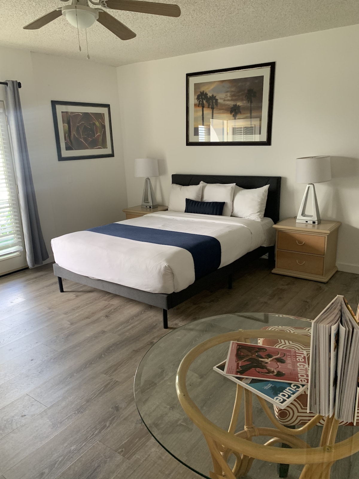 Watch the sunrise early morning and sunset in the evening without leaving your room. This bedroom features panoramic windows that give you full view of our local San Jacinto Mountains. The unit is a corner room located on the first floor. Has a king-size bed, Smart TV, and private bathroom. Soak in natural mineral waters at our pool and Jacuzzi after a trip to Joshua Tree or enjoy a nice glass of wine in our backyard.