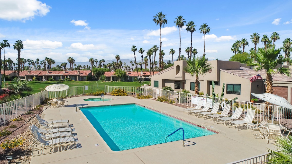Escape to your private desert oasis—where sunshine, palm trees, and peaceful golf-course views create the perfect Indio getaway. 💦 Saltwater pool & free spa heating 🎮 Game room: pool table, ping pong, arcade & smart TV 🛏️ Sleeps 10: 2 Kings, 1 Queen, Queen+Full bunk 🍳 Chef’s kitchen + coffee bar 🔥 Fire pit, BBQ, outdoor dining & lounge 🎾 Tennis, pickleball & gym (4 guests) 🚗 Near Indian Wells, La Quinta & Joshua Tree