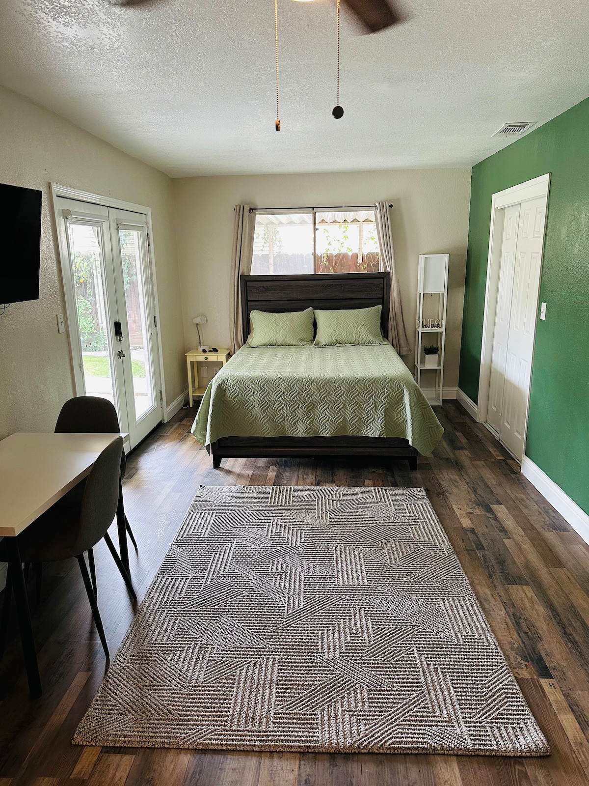 You will be close to everything when you stay at our Clean and Private Bungalow! Easy, Private Check-in, Private Bathroom, Instant Coffee Station, Small Fridge, Safe Neighborhood, Updated Studio. Just minutes away from Restaurants and Entertainment. Just minutes away from Fresno Airport. Sleeps up to 4 guests with 1 King Size Bed and 2 Twin Size beds Trundle Style. (Kids Free, 3rd 4th Adult Xtra Fee) Families Welcome. Pets welcome with small Pet Fee. Absolutely no smoking inside! Please