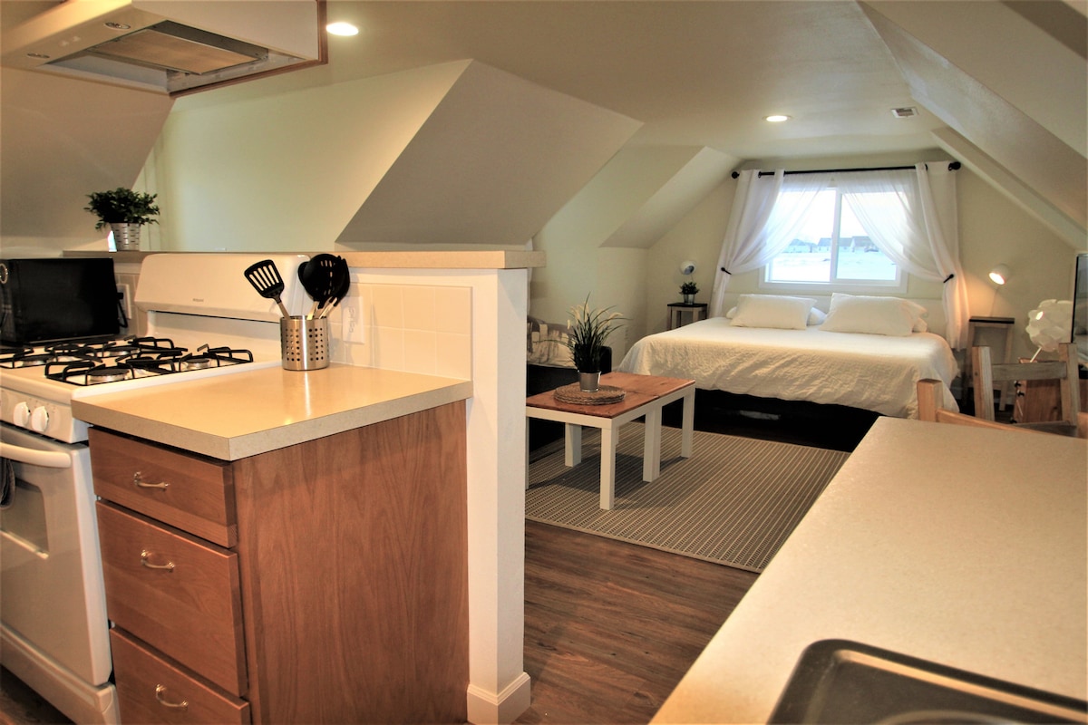 Stay in the heart of Kendall Yards in this stylish studio loft above Uprise Brewery! Walk to restaurants, shops, and the Centennial Trail. This cozy, open-concept space features a queen Murphy bed, full bath with walk-in shower, organic bedding, free WiFi, premium coffee, and local artwork by Ben Joyce. Kitchenette includes a mini fridge, microwave, toaster, and coffee maker. Note: This unit is located above a brewery, so minimal noise may be heard. Quiet hours are observed from 10 PM to 7 AM.