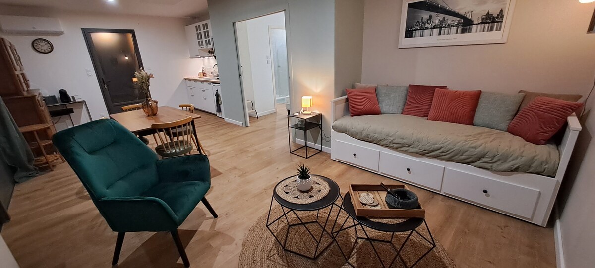 Idéalement situé à 5 minutes du Parc des expositions d’Angers et à 2 minutes de l'échangeur de l'Océane pour rejoindre l’autoroute A11, ce logement de 20m2 est idéal pour séjourner seul, en couple ou en famille avec 1 enfant (possible bébé avec prêt d’un lit parapluie). Nous avons voulu créer une ambiance tout en douceur avec du bois, du rotin, de la dorure, du marbre et des teintes claires pour vous offrir un merveilleux séjour !