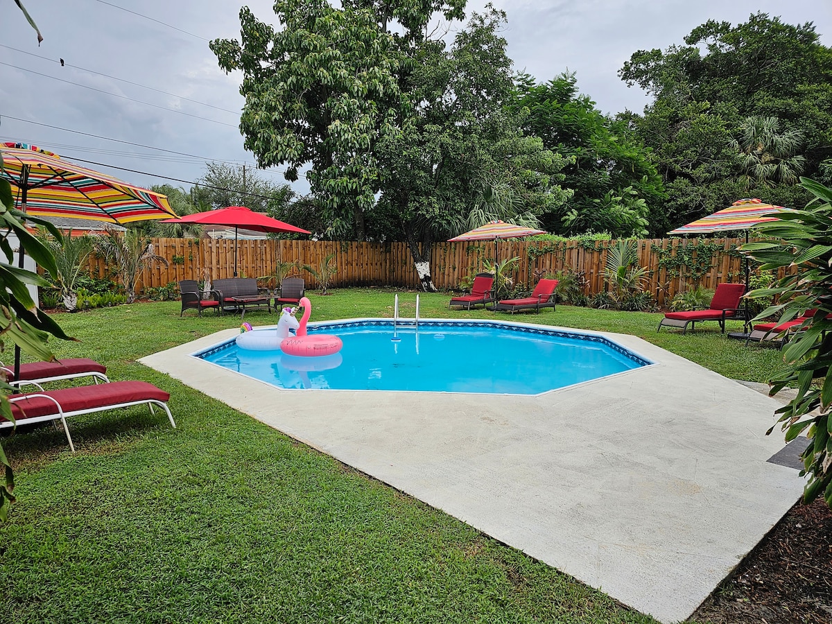Welcome to our cozy pool home with screened porch, deck w/ remote control lighting of cabana for evenings. Grill, tropical fruit trees, plants & private fenced yard. Coastal cottage decor mixing vintage finds in newly remodeled space. Neighborhood is peaceful w/ close drive to beaches, restaurants, golfing, parks & shopping. Each bedroom has cooling mattress pads & ceiling fans. Pets welcome! Beach chairs, cooler, bikes, beach umbrella, pool floats, yoga mat, games/books-.Long stays welcome