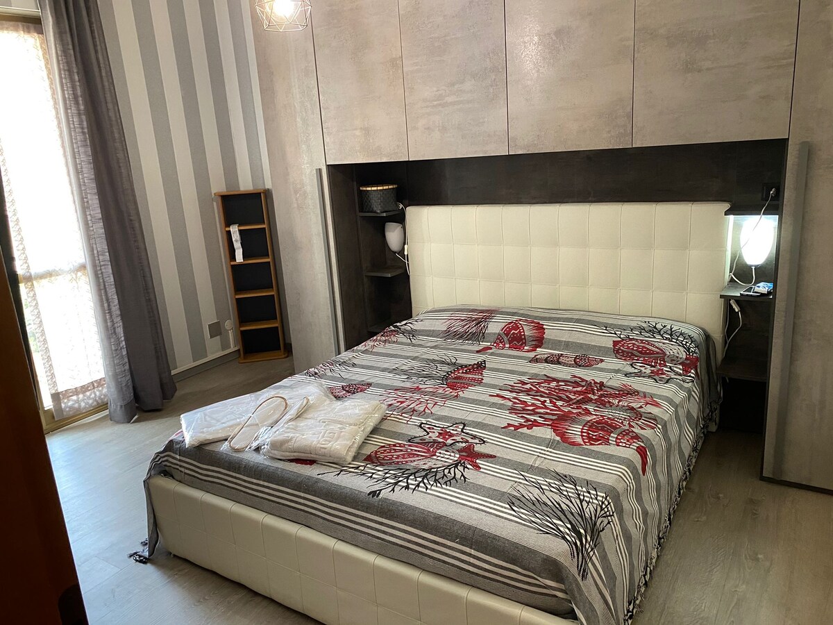Camera doppia con letto a due piazze,bagno privato separato dalla camera da un antibagno La camera è fornita di armadio a muro con cassaforte interna e cassettiera fornita di specchio. Disponibile TV via cavo e canele Netflix (messo gentilmente a disposizione degli ospiti) fornisco set biancheria per bagno (doccia,mani e viso ,intimo) fornisco set detergenti ( mani,doccia,intimo) set per barba e pulizia orale coffe machine and mini fridge Non forniamo servizio colazione ,ascensore non presente