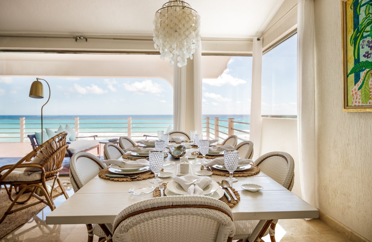 Residence located in the main street of the Hotel Zone in Cancun, in a private residential complex located on the beach. Is a lovely and big beach front Villa, with an amazing private pool in the terrace, with the Caribbean Sea facing to Women’s Island. This fantastic Residence has been recently renovated with many new upgrades, and with amazing details. In the big terrace you have a private pool, BBQ, big dinner table, outdoor living and direct access to the beach. Security 24/7. House 10.
