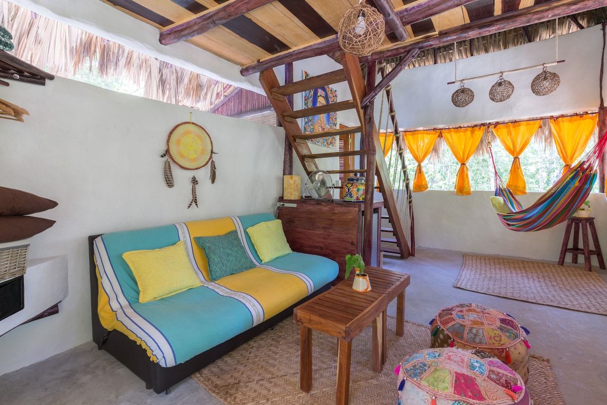 Cabaña mágica,construida de piedra maya,con su madera auntentica,junto a su tapanco con posibilidad de dormir o de nasconderse!Cabaña cuenta con escritorio,y su sedia cómoda,con la vista ala selva! Mini frigobar,cocina exterior,mesa con su 2sedia, con platos y vasos(lo básico)! Con su hamaca y sofá a fuera para disfrutar otro lado de selva!Junto a el sonido de selva, desde diferente aves, grillos! Árboles con sus Orquídeas en su temporada!Perfecta por amantes de naturaleza y tiempo of de ciudad!