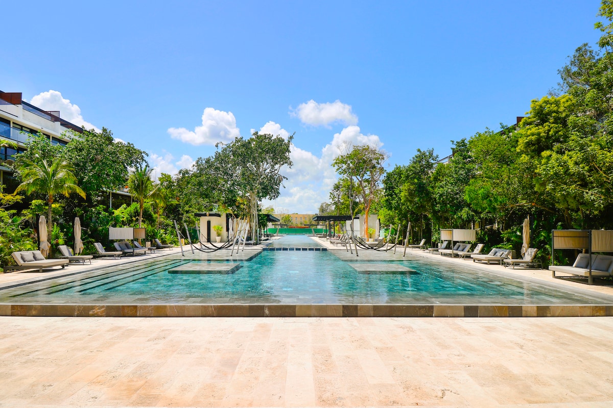Welcome to your private oasis at AWA in Playa del Carmen. - Ultra-comfortable 2-bedroom, 2-bathroom apartment - Air conditioning and ceiling fans for year-round freshness - Private terrace overlooking the pool - Huge 150m pool with built-in bar - Rooftop reserved for adults with two pools - Children's club and play areas - 24-hour reception service - Playa del Carmen's beautiful beaches just a 10-minute walk away - Xcaret Park and Quinta Avenida nearby