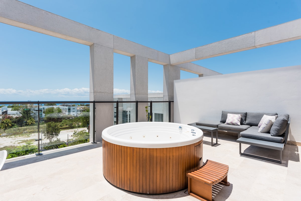 Cool and modern studio , on the roof top floor, in the exclusive hotel zone, besides Hyatt Vivid and Wyndham Alltra. Walk to 5th Av. Incredible view of the sea, fresh breeze, and spectacular terrace with private tub (not heated) overlooking the sea. You would love the place! Studio is ideal for couples Jacuzzi outside is completely private for your enjoyment. Water is not heated, its ambient temp. To access you have to walk stairs (16 steps) to access, its not for people with incapacities