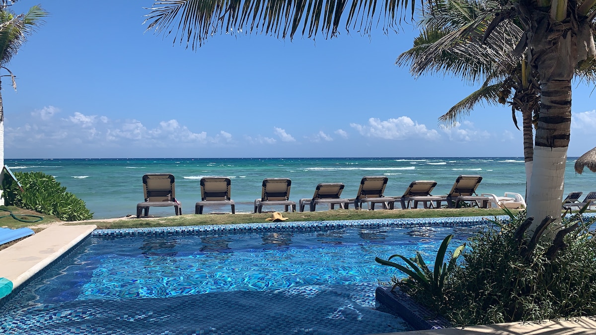 Live the experience of staying in a house facing the Caribbean Sea. With a large and heated pool you have direct access to the beach where, in season, you will see turtles that lay hundreds of eggs, right there in our yard. From the kitchen, its balcony as its three bedrooms will delight you with the sunrise and the moonrise. The large palapa at the roof offers unlimited views of the sea from the east to west and a spectacular sunset. In this house you will have memories that will last forever.