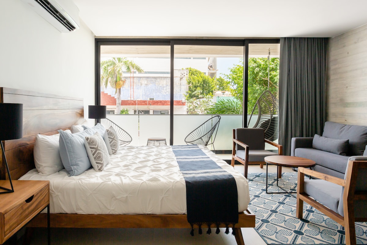 The most cozy place, with all the comfort you will need for your stay. Two blocks away from 5th Avenue, the beach, the famous, open mall, Paseo del Carmen, as well as the ferrys to Cozumel. Modern, new furniture offering comfort, and a moment to relax. Enjoy the amenities such as a cup of coffee in the balcony with amazingly comfortable chairs, as well as a big kitchen for cooking lovers. The best moments in the common pool at the roof top with an ocean view, just beautiful. 70 MEGAS wifi