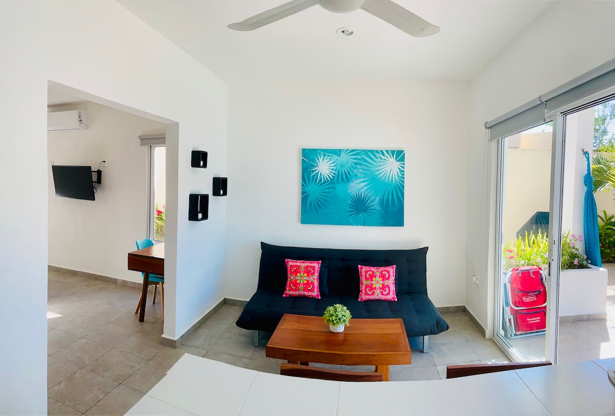 Charming & private 1BR apartment in Tulum ♡ • Top Rated On-site restaurant Aroma Cafe Tulum • Cenote-style pool with massage jets • Self check-in after 3:00 pm • Check out: 11:00am • 1,000 Mbps Fiber Internet • Full A/C • 1 King-size bed + 2 single bed "sofa beds" • 42" 4K Smart TV with satellite & Netflix • Private en-suite bathroom • Fully equipped kitchen + dining area • Free private parking • Outdoor grill • Exclusively for 2 adults & 2 children