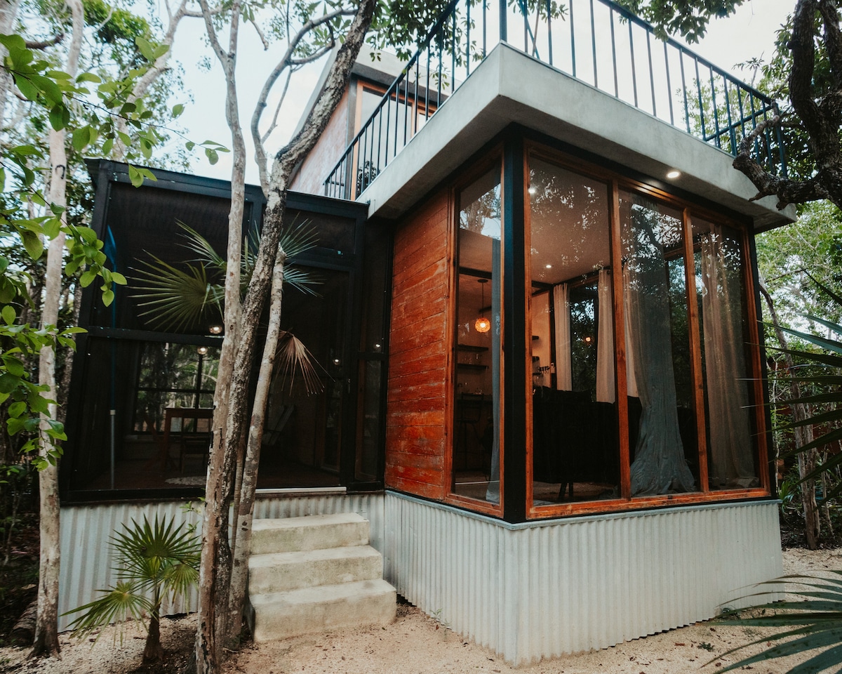 Come stay in your own rustic oasis in the Mayan Riviera landscape nestled in nature's mangroves of Tulum w/splash pool. One Bedroom first floor cabin unit in a jungle like setting in a gated area, but still located on the main rd of Carrillo Hwy 307/Carretera Tulum, just 5-10 mins from downtown w/panoramic views, 15 mins from Tulum's turquoise beaches & 20 mins from the Ruins! Sofa-bed in living room. Has high speed fiber-optic internet service. Many beautiful Cenotes to visit down the road!