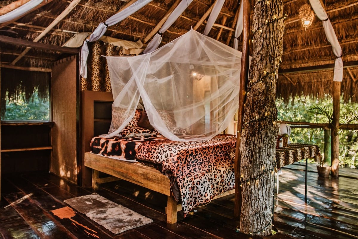 EXPERIENCE THE MAYAN JUNGLE... and discover its magic! Private plunge pool. Starlink internet. Connect with nature from this boutique cabin with stunning architectural design and exceptional views. Collector's items, king-size bed, fully equipped kitchen, and fine local materials. 16-foot (5-meter) high screened windows. Total immersion. Extra services: Candlelit dinner under the trees / massages / ceremonies and yoga classes. (Inquire about the service that interests you.)