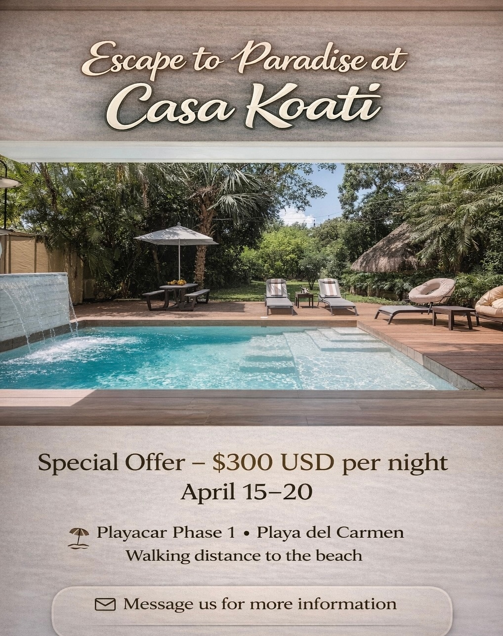 Casa Koati is a new house, with an unbeatable location; we are only 5 minutes walking from the beach and 5 minutes walking to the well known "5th Avenue" and the Mall "Paseos del Carmen" of Playa del Carmen. The house is located in the exclusive residential of Playacar Phase 1, having 24 hour security available and controlled access. The house is perfect for any type of group of 8 people, wether for a family with kids, a group of friends or couples.