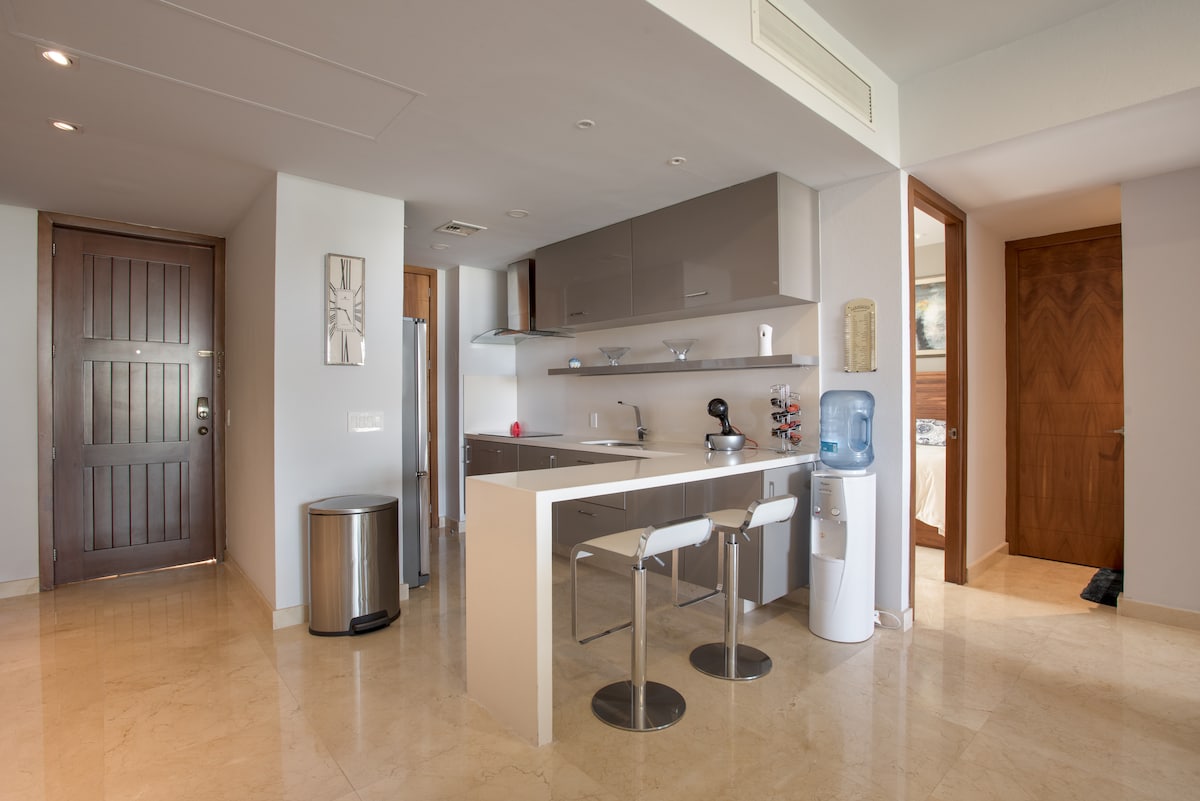 Condo Rosina is a freshly updated 1-bedroom condo on the 4th floor of 3.14 Living in Nuevo Vallarta repainted in June 2025. Enjoy mountain views and a cozy balcony with BBQ and sunrise view. Sleeps 2 with a king bed, 1 bathroom with shower, fully equipped kitchen, coffee station, high-speed internet, great new A/C, and a dedicated workspace. Spacious living area with large couch. Walk to the beach in 8 minutes or enjoy cafés, restaurants, and shops just downstairs. Peaceful and well located.