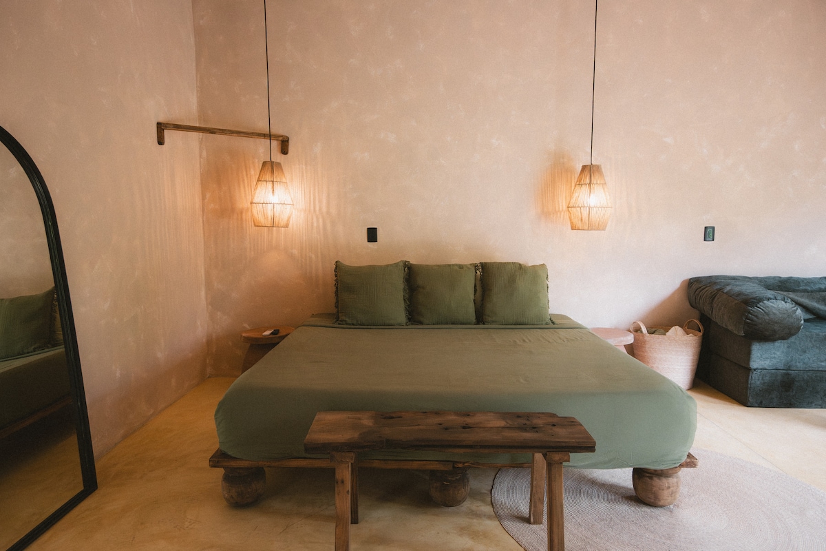 Experience life in the jungle and sleep peacefully surrounded by lush landscaping. Sit out on the oversized patio with bathtub, chairs, a hammock, and space for morning meditation. ​ Our Wild Studio with garden view combines a modern yet jungle chic feeling highlighted by Mexican color accents and decorative style, this large comfortable studio comes with a/c , Macbook Air, designer sofa, exterior bathroom and shower.