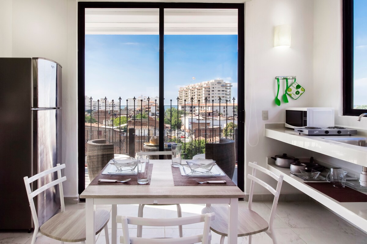The Panoramic Room is an ideal unit for couples looking for a romantic and luxurious space. The private jacuzzi on the balcony with sea view makes this studio an amazing option. Featuring High-Speed Wifi, Beachfront, Smart TV, Mini Fridge and Incredible Views to the Bay of Puerto Vallarta. Part of Hotel Marboka, reason why you will have access to more services providing a better experience.