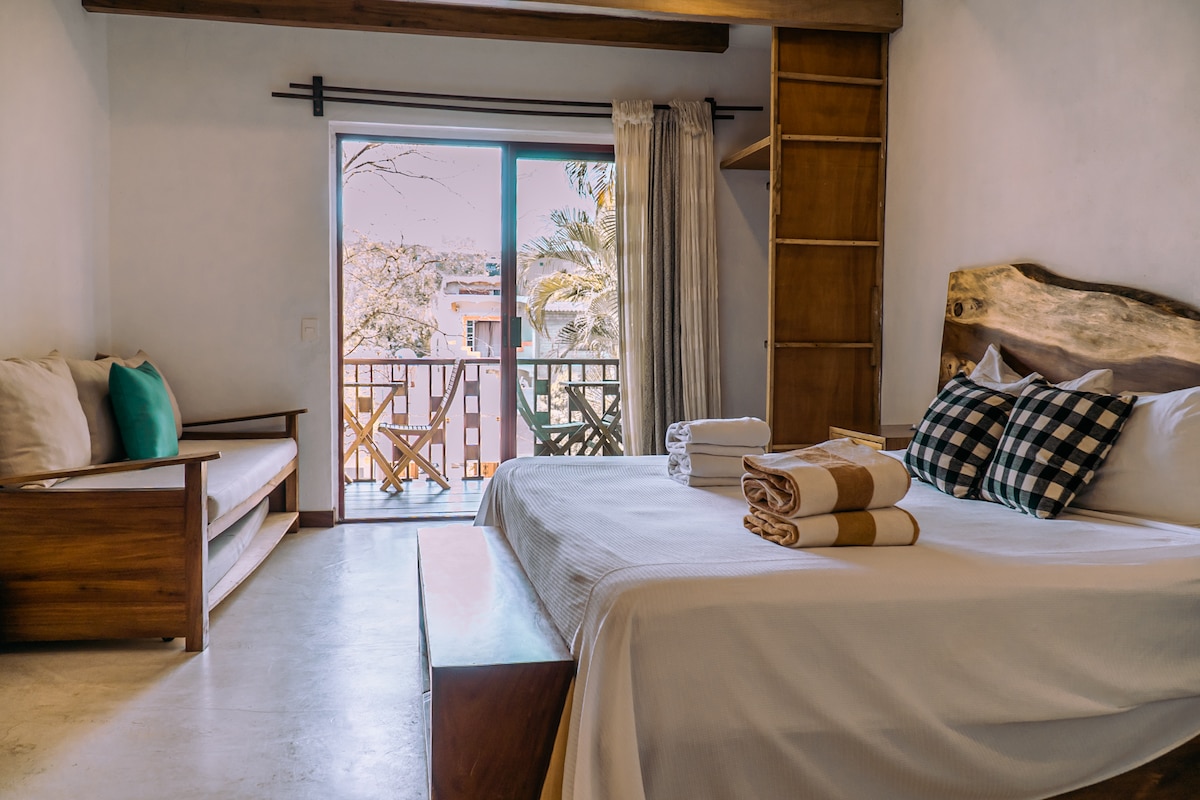 Experience life in the jungle and sleep peacefully surrounded by lush landscaping. Sit out on the oversized patio with bathtub, chairs, a hammock, and space for morning meditation. Our Wild Studio with garden view combines a modern yet jungle chic feeling highlighted by Mexican color accents and decorative style, this large comfortable studio comes with a/c , Macbook Air, designer sofa, exterior bathroom and shower.