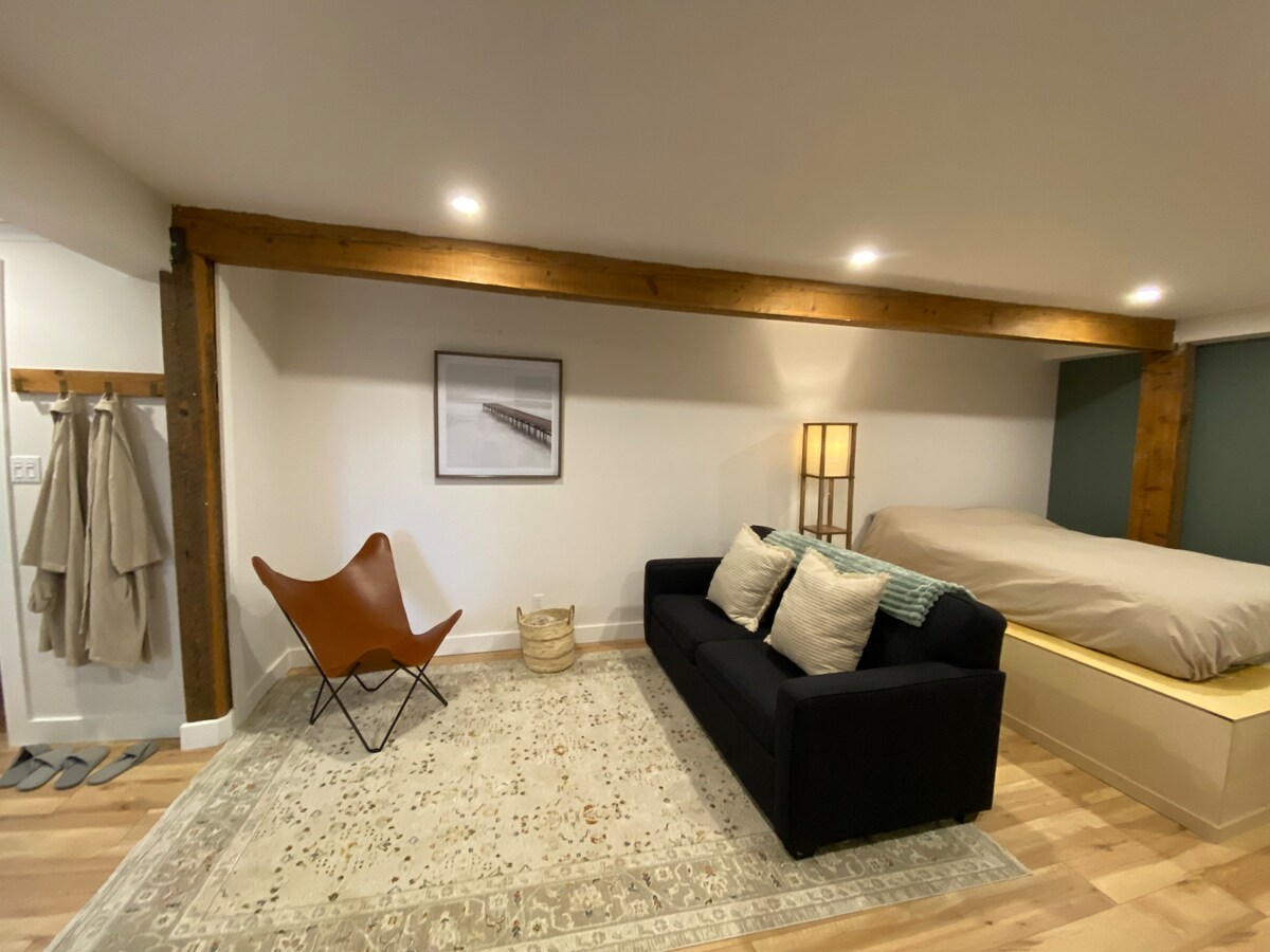 Studio demi sous-sol luminosité faible et insonorisation limitée dans une maison résidentielle avec porte indépendante et stationnement. Arrivée autonome sans contact proprio. Possède un lit Queen, une causeuse, une TV (cable de base), bureau de travail, salle de bain avec douche et un coin cuisinette (frigo, toaster four, micro-onde, cafetière kurig, bodum) pour déjeuner /réchauffer un repas seulement (aucune cuisson possible à l’intérieur avec un appareil d’appoint). WiFi. CITQ #310834