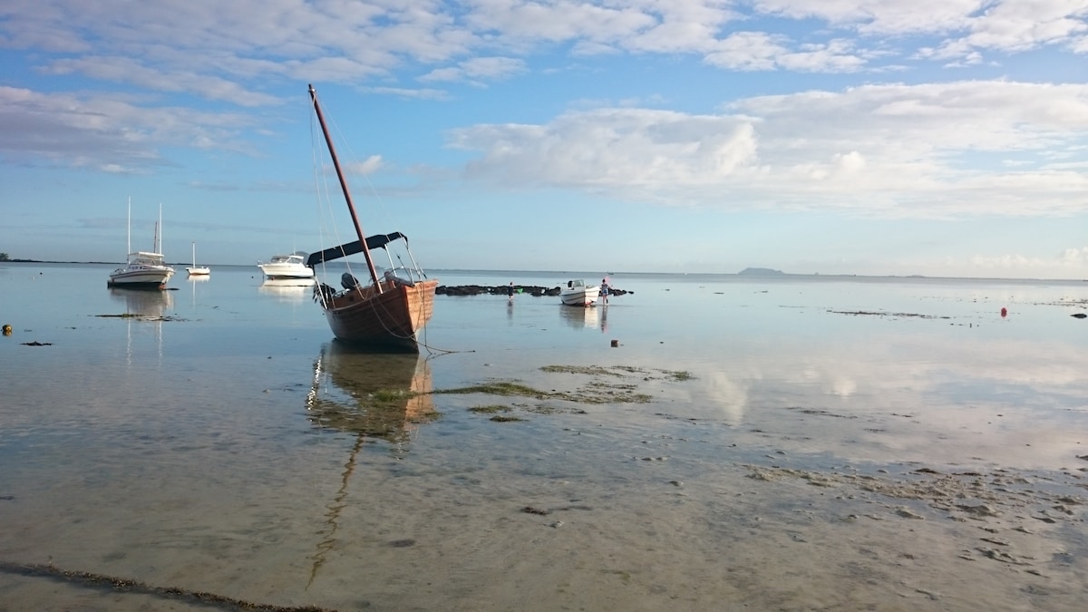 Gemütliche 2-Zimmer-Strandwohnung in Bain Boeuf, Pereybere, Grand Baie. Die Altbau-Wohnung bietet alles für einen entspannten Urlaub: voll ausgestattete Küche, Paletten-Couch, 55-Zoll-Smart-TV, Internet und eine kleine Terrasse. Im Garten gibt es einen 4x4m-Pool und einen BBQ-Bereich. Die Lage ist perfekt – nur die Straße überqueren und Sie sind am Strand. Supermärkte und Grand Baie sind in wenigen Minuten erreichbar. Ideal für eine ruhige und erholsame Auszeit.